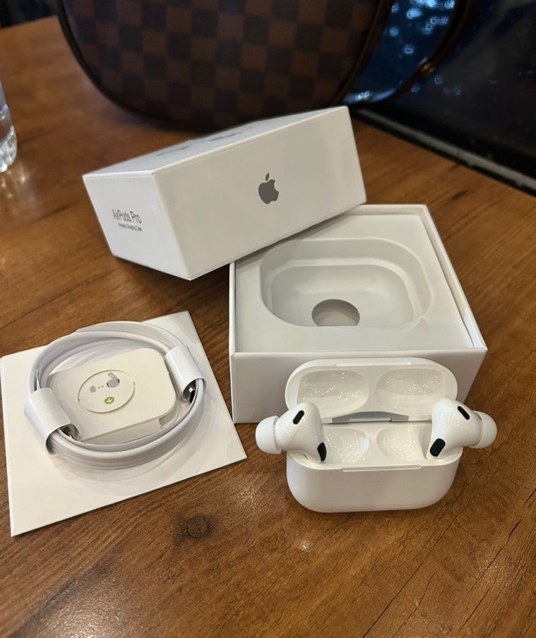 Şarj kutusu ve kablosu ile birlikte beyaz Apple AirPods Pro kablosuz kulaklık. Kompakt ve taşınabilir tasarım.