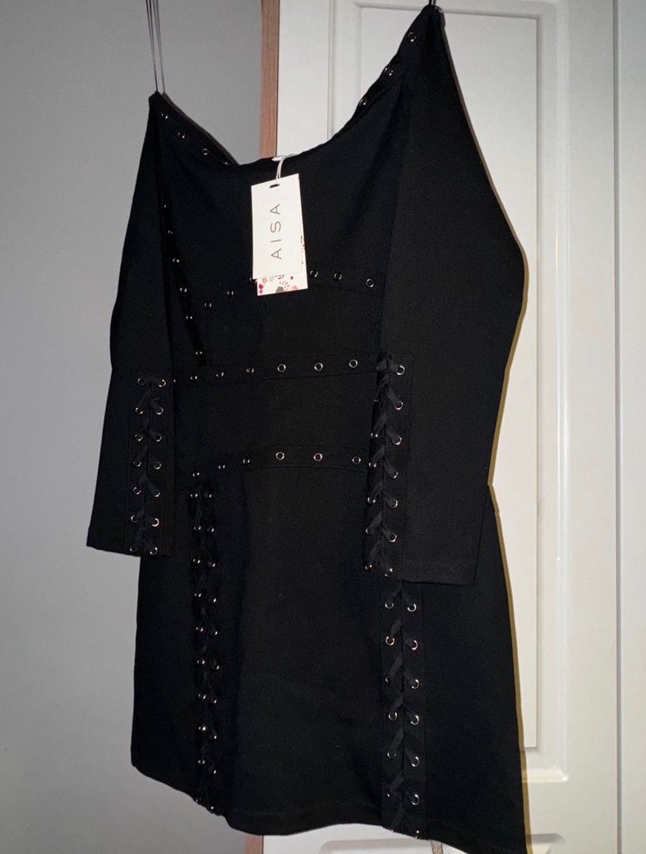 Siyah, straplez yaka ve askılı kollu, işlemeli detaylı, düğmeli, gotik tarzda, vücuda oturan midi elbise. Romantik akşamlar için uygundur.
