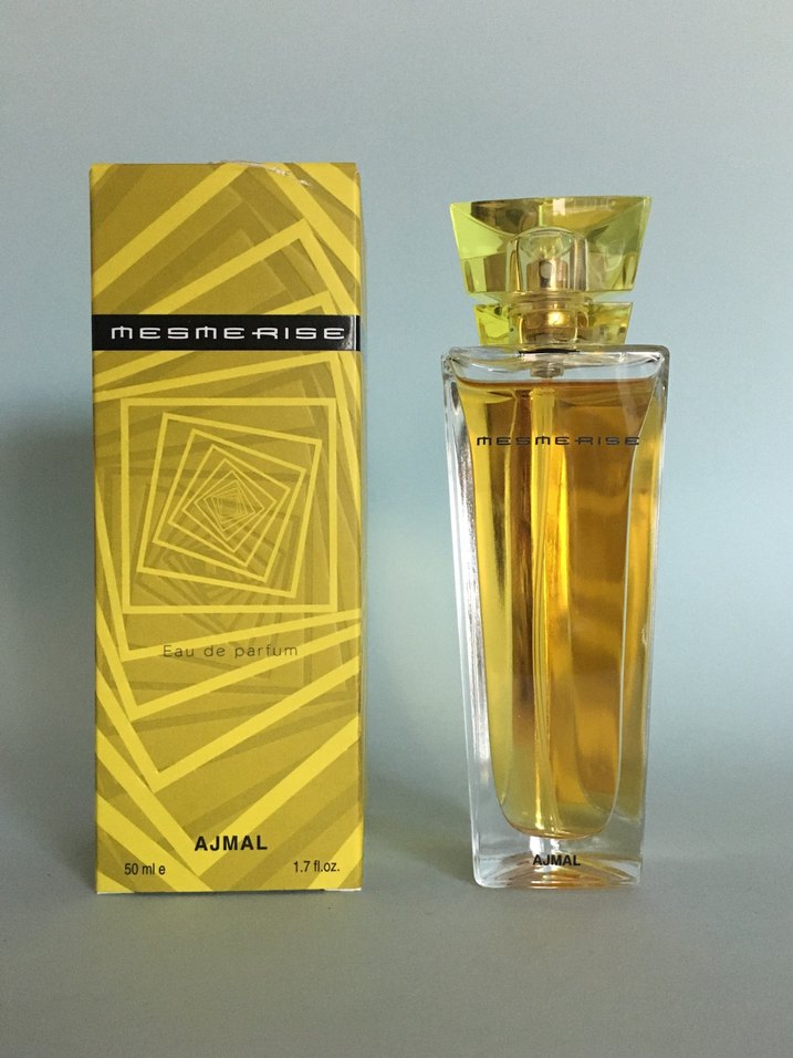 Ajmal Mesmerise kadın parfümü, 50 ml şişede ve altın sarısı tasarımla sunulur. Büyüleyici bir koku deneyimi sağlar.