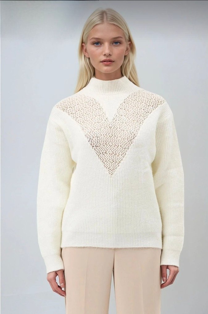 Standart beden ekru ajurlu triko kazak. İki kol altı 50, boyu 58 cm. Marka temsili.