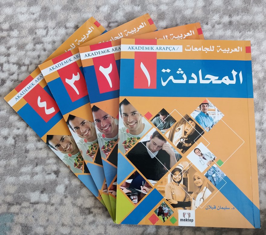 Sadece 1. cilt biraz kullanılmış ve biraz not alınmıştır. Diğerleri hiç kullanılmamıştır. Üniversite öğrencileri için numaralandırılmış 1'den 4'e kadar dört adet akademik Arapça dil kitabı seti. 1. cilt 182 sayfa 2. cilt 180 sayfa 3. cilt 184 sayfa 4. cilt 165 sayfa.