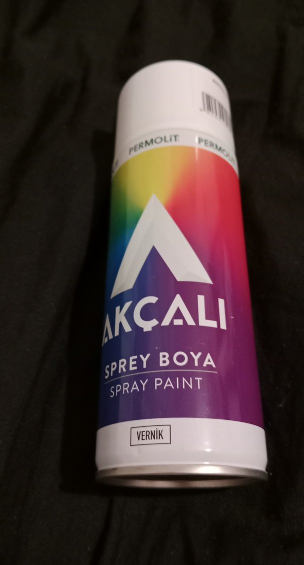 Akçalı çok renkli sprey boya, vernik kaplamalı, çeşitli yüzeyler için uygundur.
