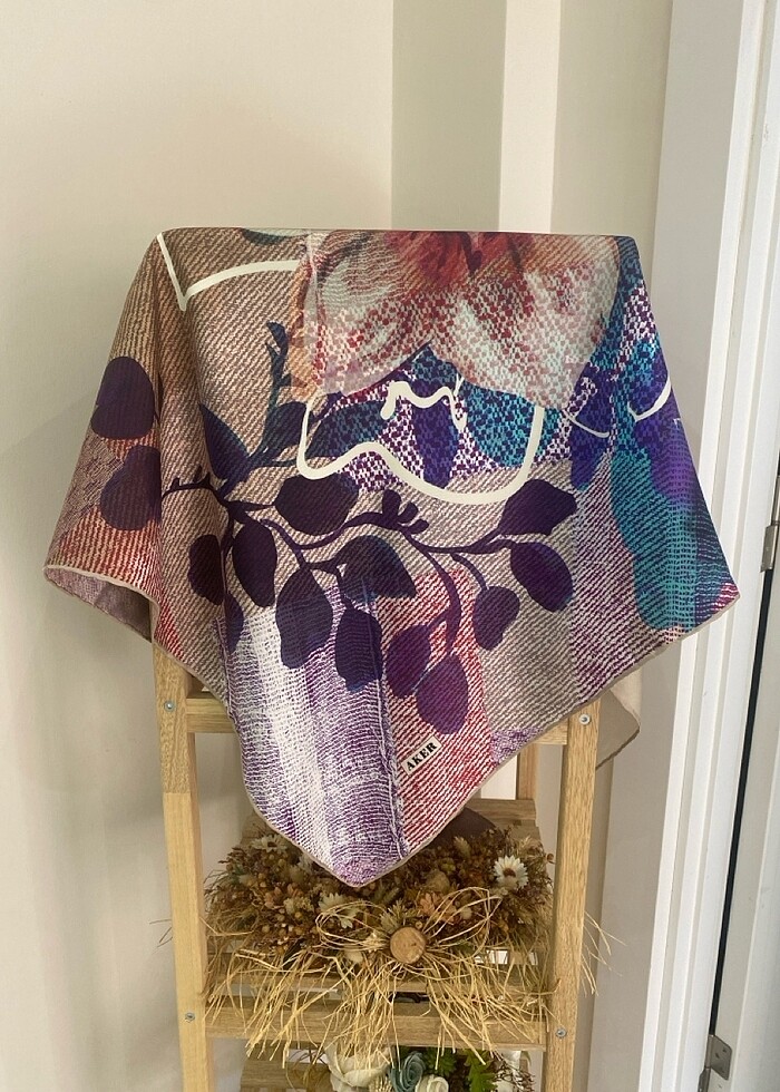 Aker markasına ait ipek eşarp. Pastel tonlardadır. Her kıyafete rahatlıkla kombinlenebilir.