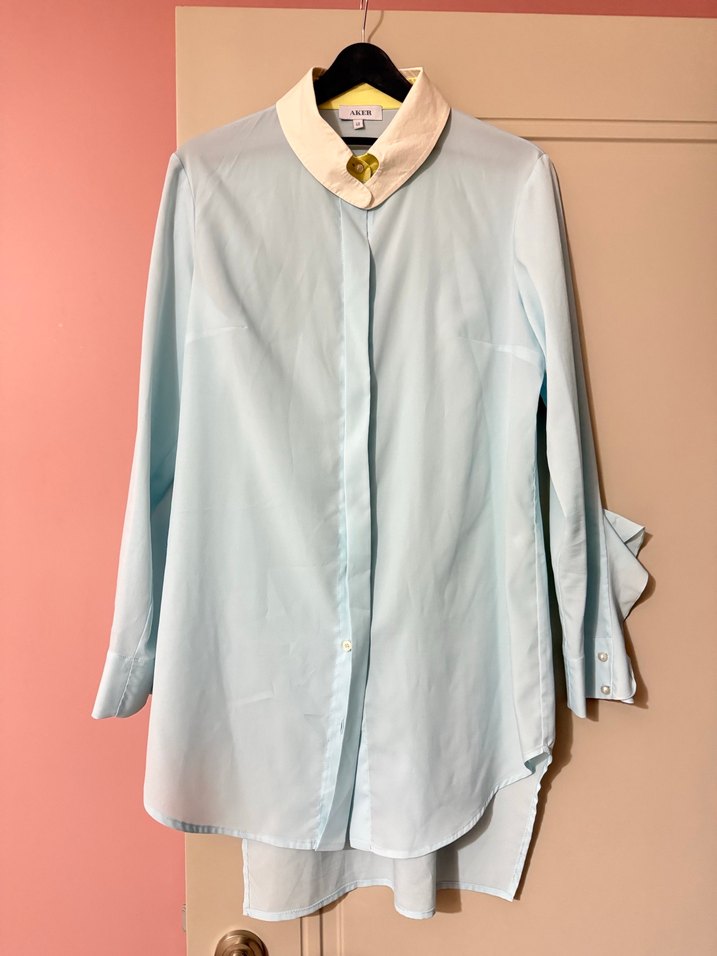 Pastel mavi renginde, uzun kollu, yakalı ve düğmeli tunik. İnce ve ipeksi kumaştan, ofis için uygun rahat kesim normcore tarzında. Çekim için kullanıldı. Gizli düğmeli ve kol detayları fırfırlı. Bedeni olmadığı için satışta. Leke veya ip çekmesi yoktur. İki kol arası: 50 cm boy mn: 70 cm arka 85 cm #lutvenizade #yargıcı #parkbravo #nu #zara #mango #aker #armine #suud #mevra #aybikestil #manuka #minikterzi #armine #armağan #bershka #fabrika #mavi #ipekyol #network #ugg #adl #benetton #beymen #boyner #bluemint #cos #chanel #dior #fendi #gap #hermes #lacoste #machka #massimo #mudo #oxxo #oysho #penti #pologarage #pullandbear #twist #vakko #karaca #kuaybegider #touche #aker #gömlek #şık #mavi #tunik