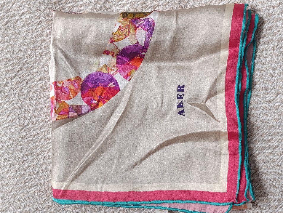 Aker imzalı kadın şal, ipeksi dokusu ve pastel çok renkli drapeli tasarımı ile bohem tarzı ve şıklığı bir arada sunar. Foto çektim çok belli olmamış az kullanmama rağmen haliyle iğne izi ve küçük lekelenmeler var