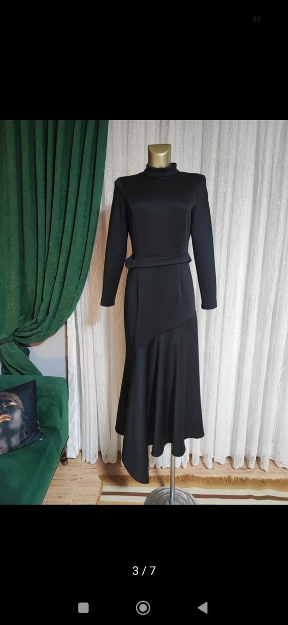 Kemerli bel, uzun kollu ve yüksek yakalı siyah uzun elbise. Düz ve klasik goth tarzında, rahat kesim ve sentetik kumaştan üretilmiştir.