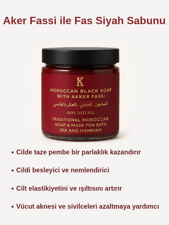 Aker Fassi ile Fas Siyah Sabunu, cildi besler ve nemlendirir, elastikiyetini ve ışıltısını artırır, vücut aknesi ve sivilceleri azaltmaya yardımcı olur.