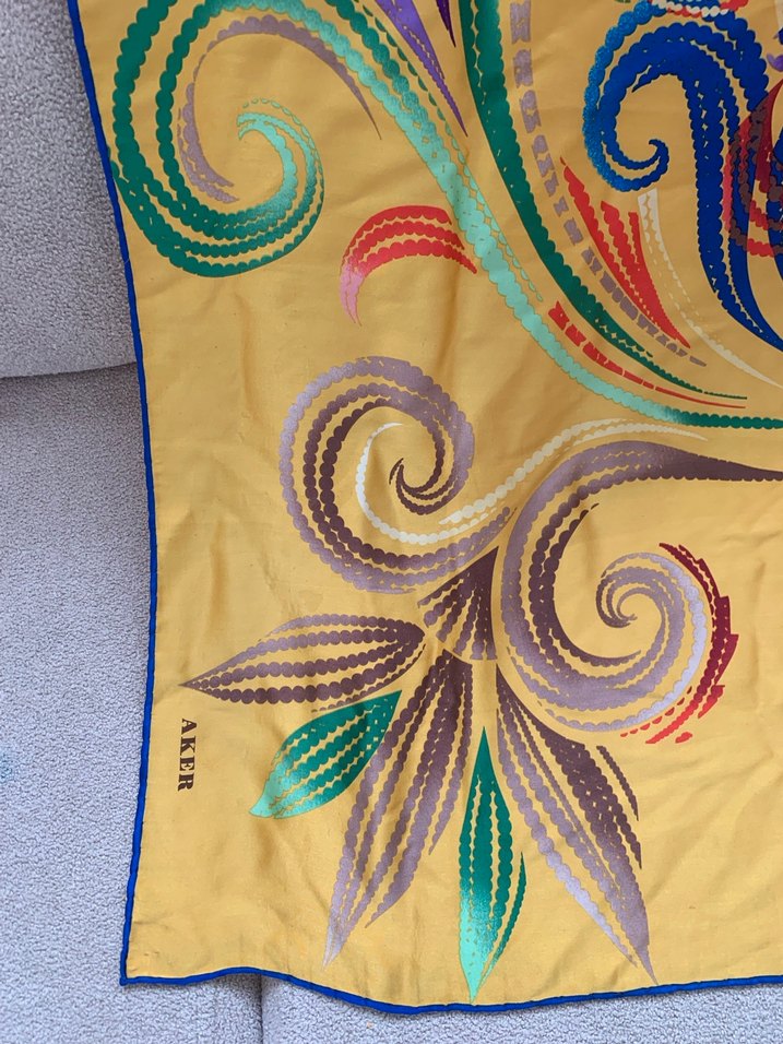 Parlak çok renkli desenlere sahip, ipek eşarp. Bohem ve retro tarzını yansıtır, AKER markalıdır.
