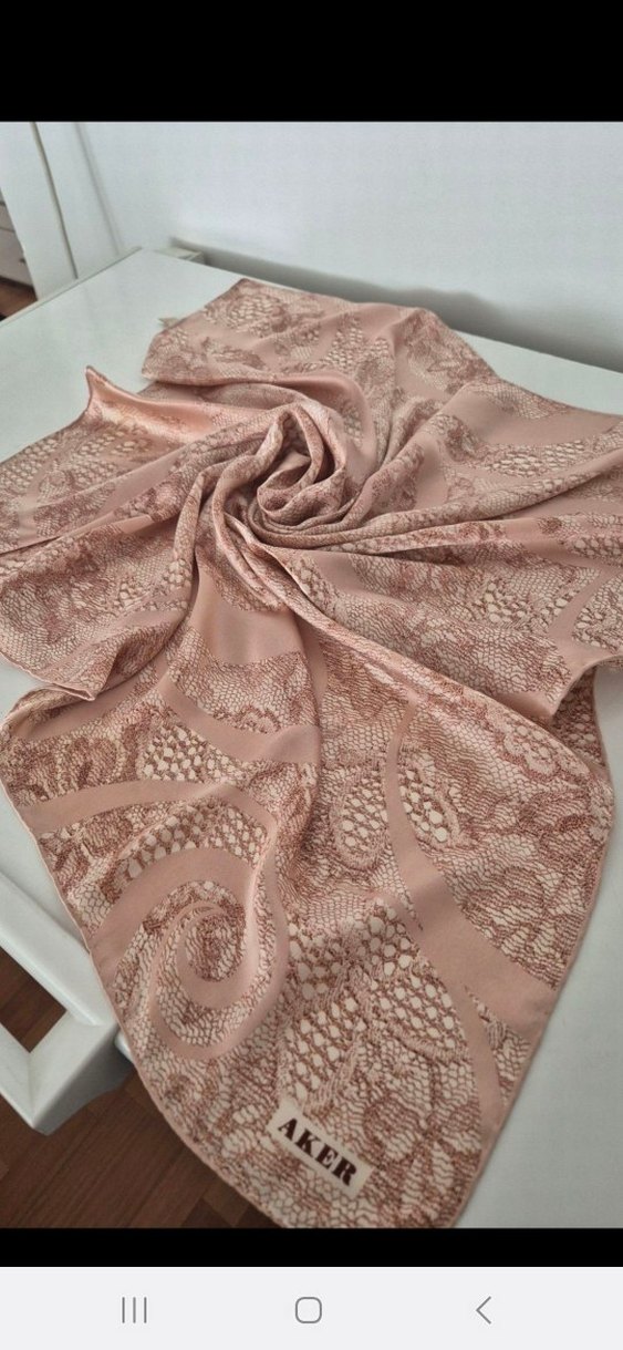 Aker sura ipek eşarp. Bir kaç kez mıknatıs ile kullanıldı. İğne izi yoktur. Pudra rengi soft bir tonu vardır.Ciddi alıcıya indirim yapılır.