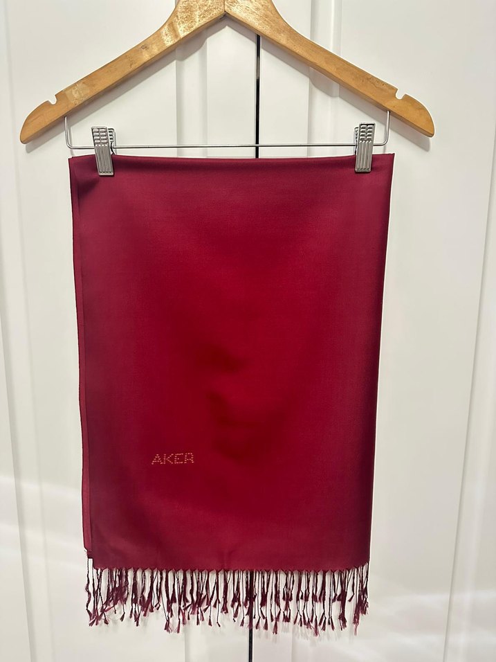 Bordo renkli, ipek parlak ve drapeli dokusu olan, püsküllü kenarları bulunan AKER markalı kadın şalı. Paris esintili bohem tarzda, sade ve şık. Belirsiz kuru temizlemeyle çıkacak lekeler vardır