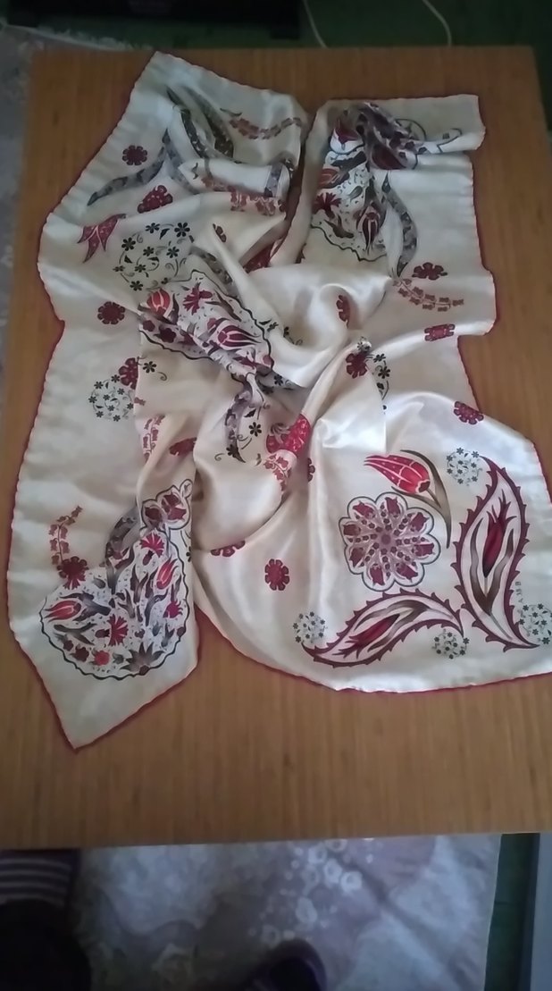 İpek dokulu, bohem desenli ve hafif bordo renkli, drapeli kadın fularıdır. Retro ve hippie tarzına uygundur. zemini bej tonda sayılı kullanıldı temiz
