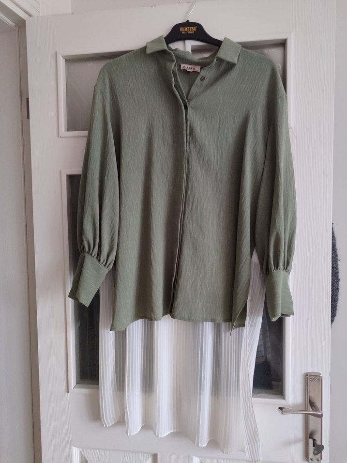 Keten kumaştan, bol kesim, uzun kollu, haki ve gri tonlarda pilili etek ucu detaylı, yuvarlak yaka modern günlük kadın gömleği. Hiç kullanılmadı S M uyumludur