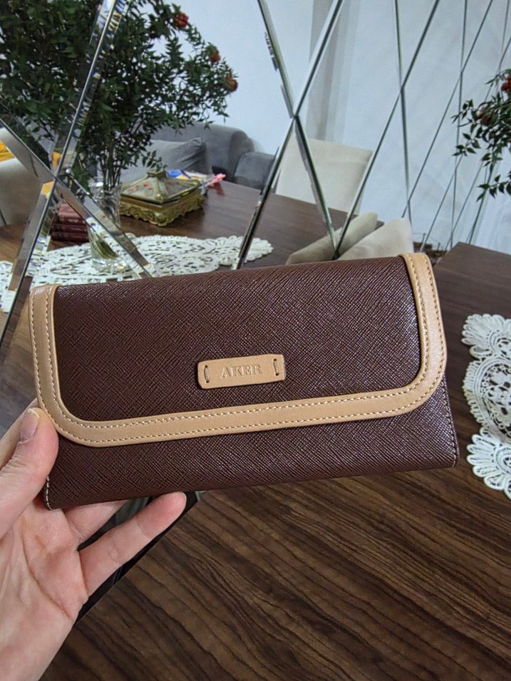 Koyu kahverengi deri, baskılı dokulu ve kemerli tasarımlı kadın portföy cüzdan, modern klasik Paris tarzını yansıtır. Günlük kullanım için uygundur. Kullanılmadı Yenidir Aker markasıdır