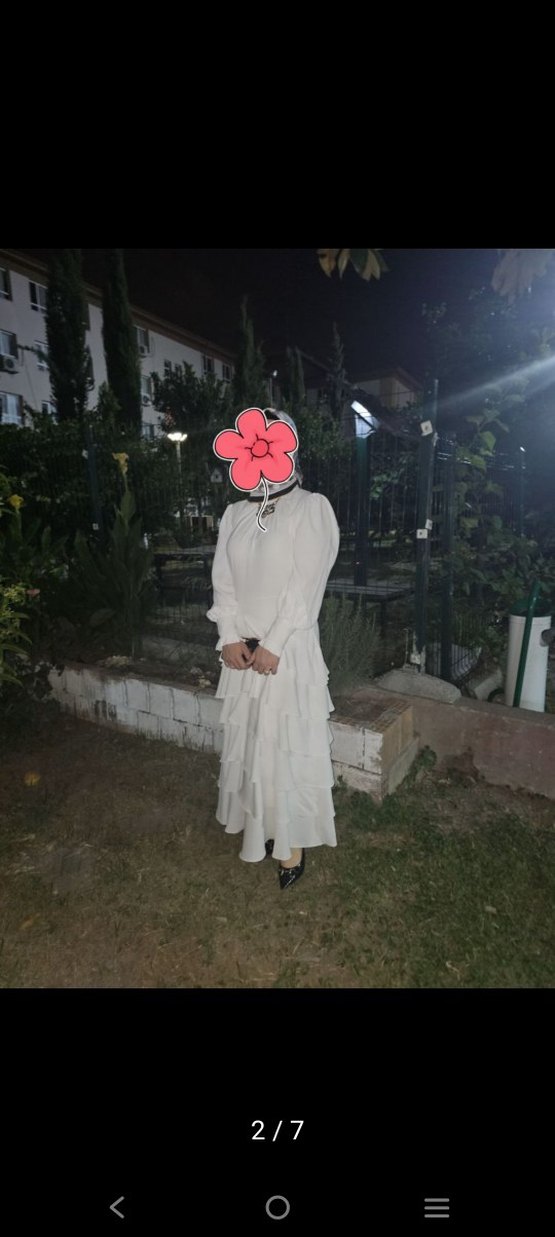Yüksek yakalı ve askılı uzun beyaz elbise, bol kesim ve volan detaylarına sahiptir. Avant-garde gotik tarzıyla hafif batik deseni birleşir, sentetik kumaştan üretilmiştir. Düğünler için uygundur. 1 kere birkaç saat düğünde giyildi. hiçbir sorunu yok sadece kemeri eksik.