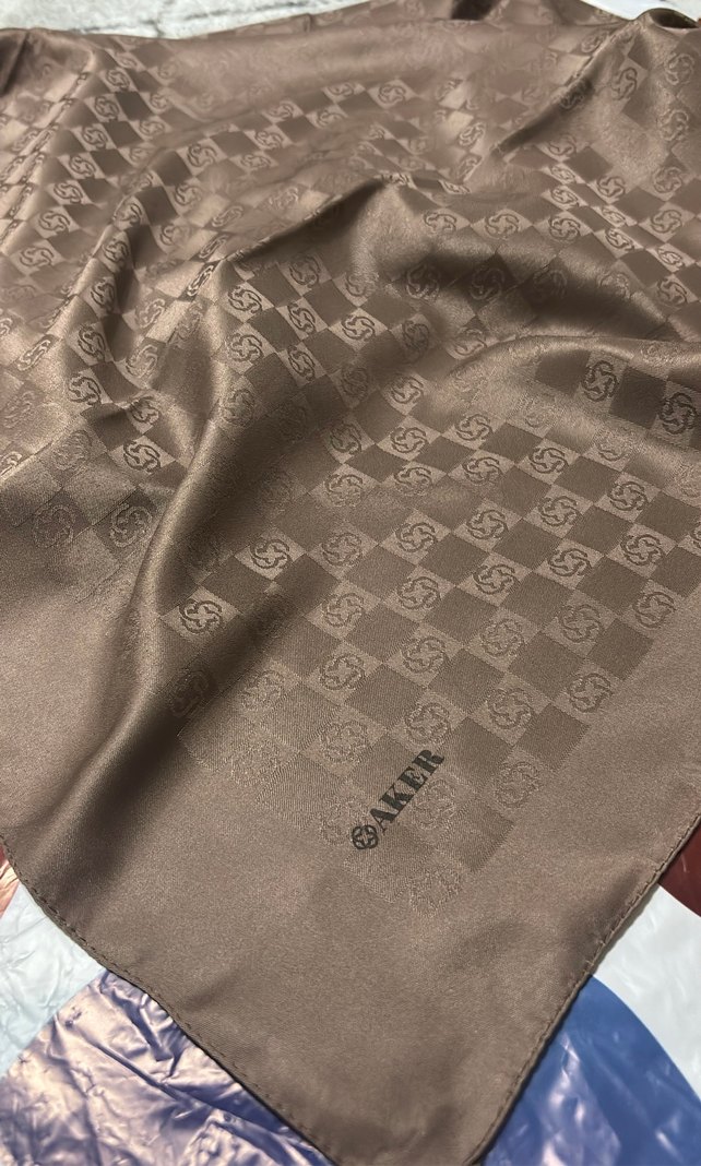 Kahverengi, parlak ve saten dokulu kadın fular, drapeli tasarımıyla klasik Paris şıklığını yansıtıyor. Üzerinde zarif desenler ve 'AKER' markası bulunur.
