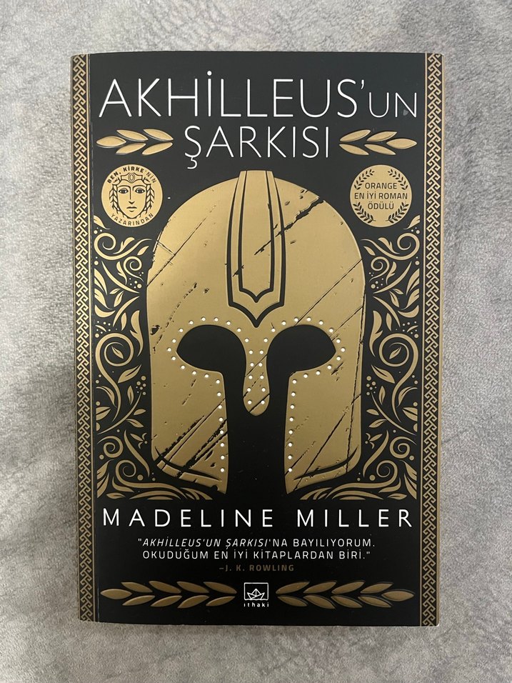 Madeline Miller'in Akhilleus'un Şarkısı kitabı, savaşçı miğferi illüstrasyonlu siyah ve altın kapak ile dikkat çekiyor. Orange En İyi Roman Ödülü sahibi.