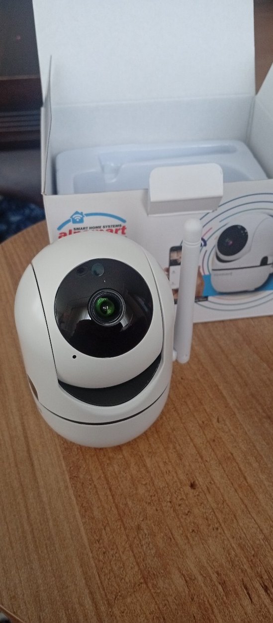 Kablosuz antenli, geniş açılı lensli beyaz akıllı ev güvenlik kamerası.
