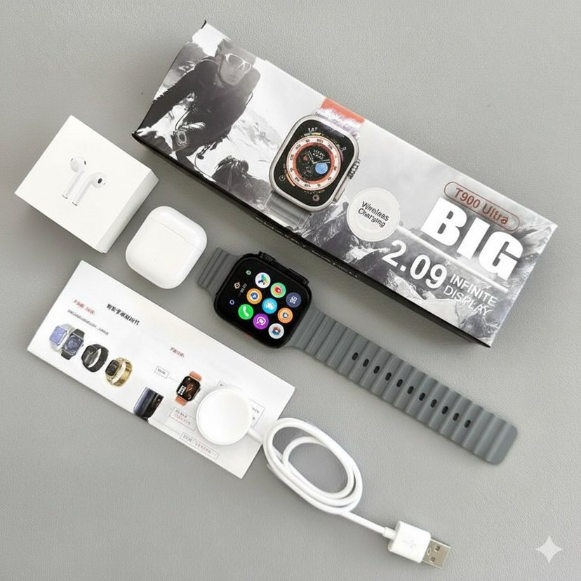Gri akıllı saat 2.09 inç ekran, kablosuz şarj ve rahat kayış sunar. Ekranında çeşitli uygulama simgeleri bulunur. ⌚AKILLI Saat ve Blohtooth kulaklik iki ürün tüm telefonlara uyumludur
