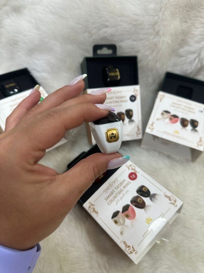 Altın detaylı, beyaz renkli, akıllı sayma yüzüğü. Kompakt ve şık tasarıma sahip.