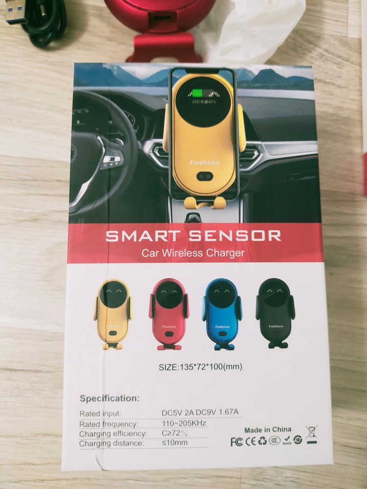 Çok renkli akıllı sensörlü kablosuz araç şarj cihazı, kolay telefon tutma ve şarj imkanı sunar. DC5V 2A ve DC9V 1.67A giriş destekler.