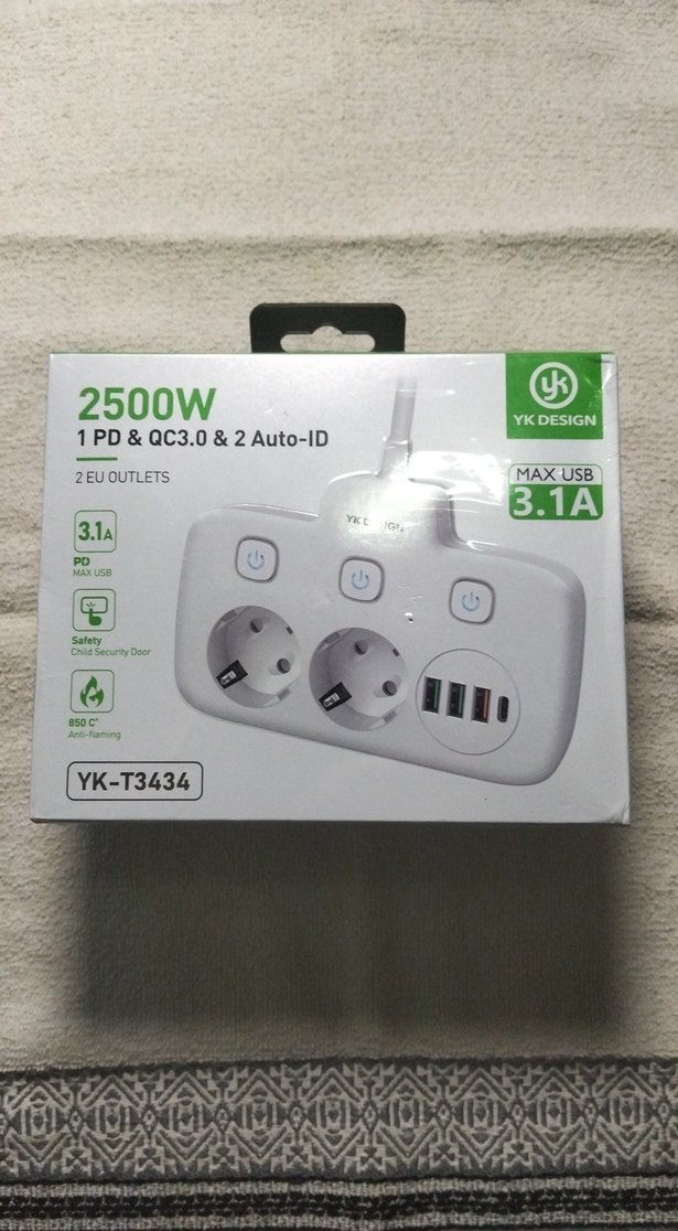 Beyaz YK Design çoklu priz, 2 EU çıkışı ve 1 PD, QC3.0 ile 2 Auto-ID özellikli toplam 4 USB portu içerir. Maksimum 3.1A USB akımı destekler. ⚡