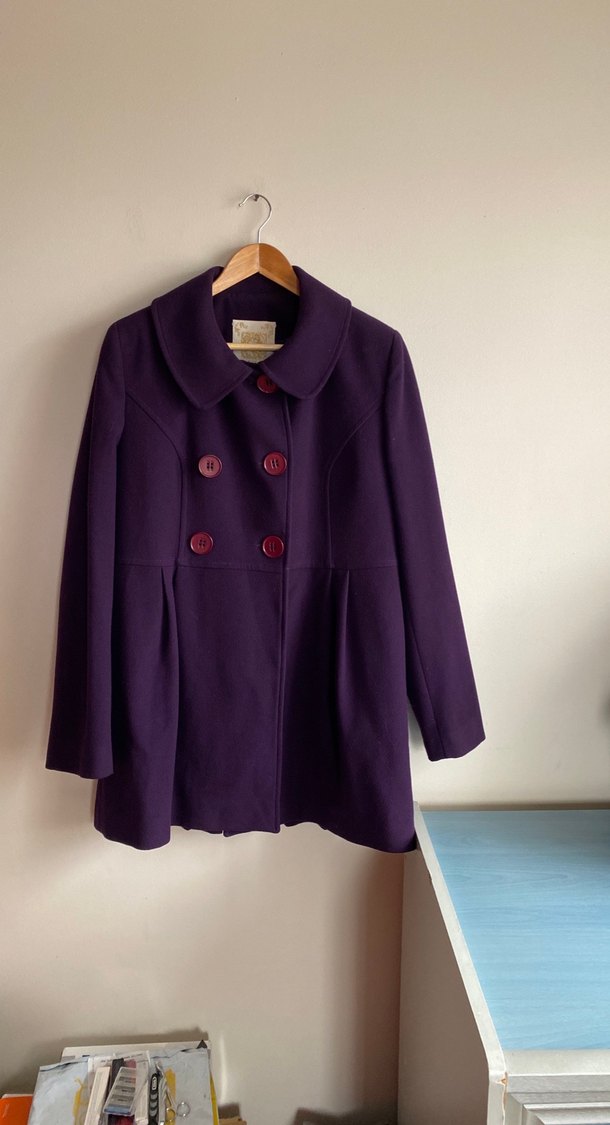 Mor renkte, çift sıra düğmeli ve yuvarlak yakalı kadın kabanı, şık ve klasik bir tasarıma sahiptir.