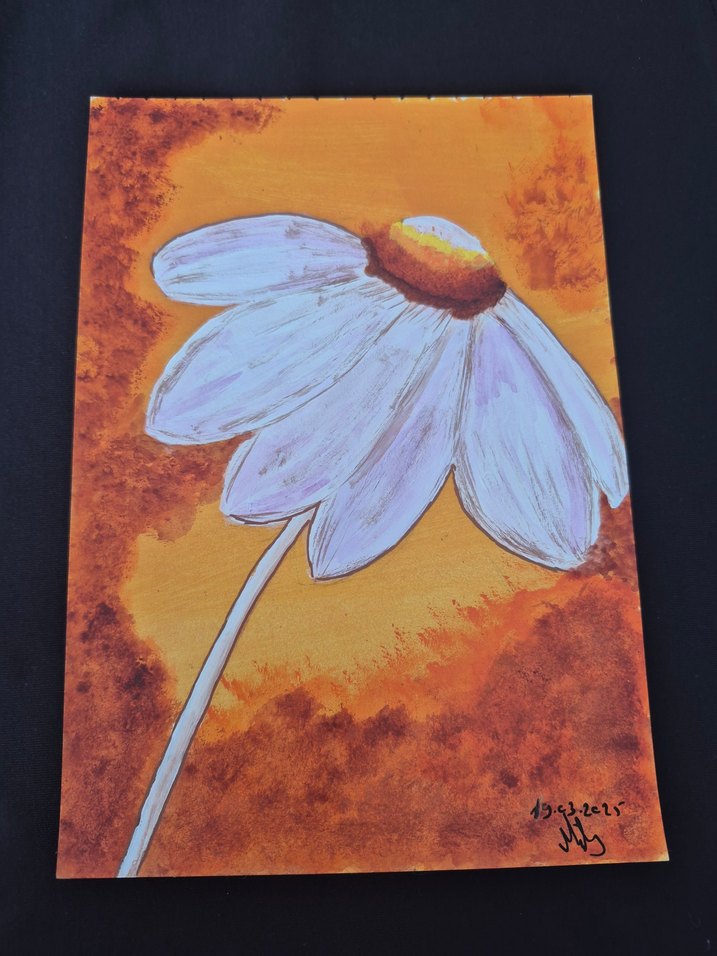 Sıcak turuncu arka planda pastel tonlarda beyaz papatya resmi Yumuşak yapraklar ve dokulu arka plan A5 boyutunda akrilik boya ÇERÇEVESİZ gönderilecektir Adeti 450 tl dir kendi ürünüm