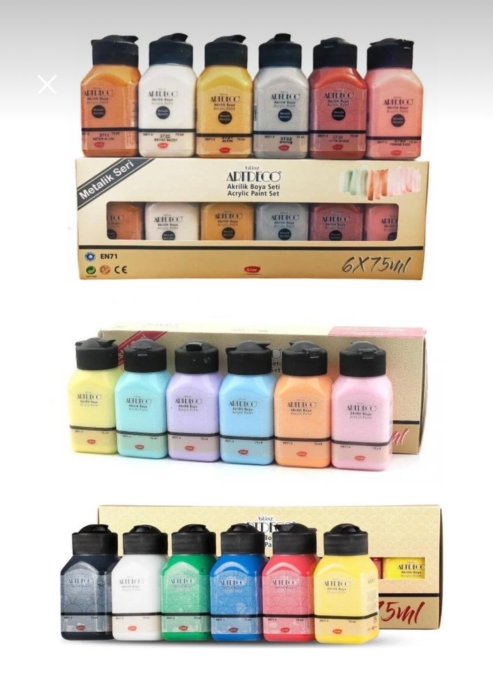 3 Set Akrilik Boya 18x75ml Metalik, Pastel, Canlı Renkler. Resim kursu için almıştım birkaç kez kullanabildim, çoğu hiç kullanılmadı bazılarını çok çok az kullandım.