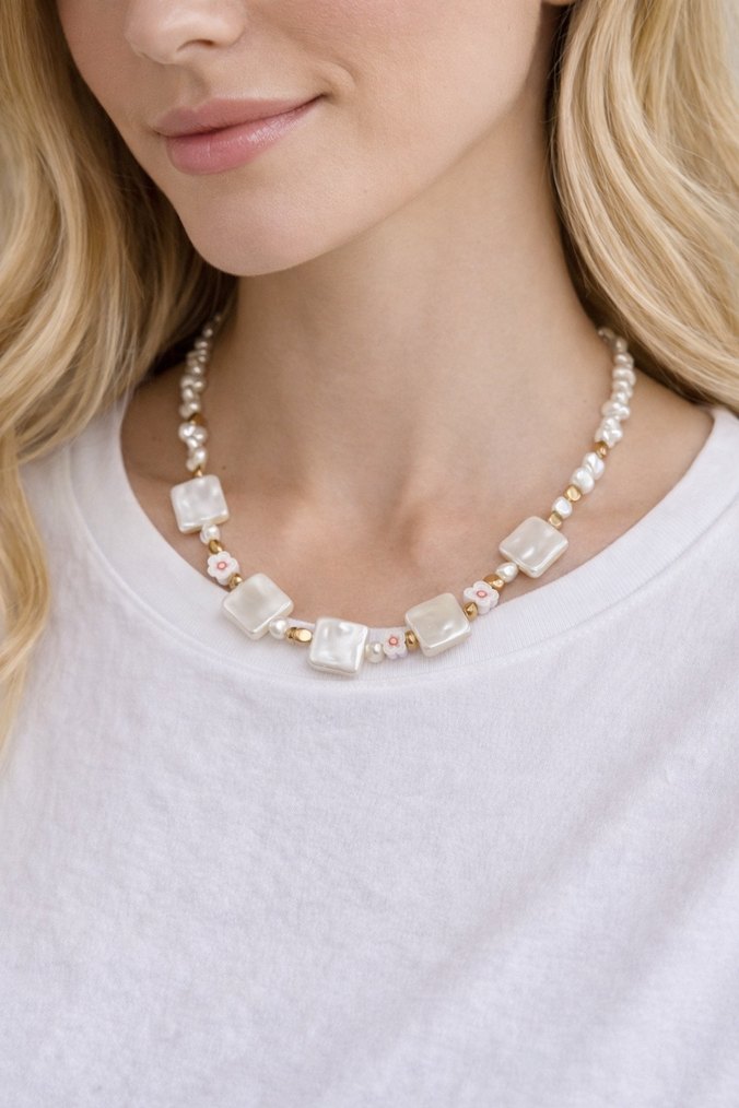 Ekru rengi akrilik inci kolye 40cm. Uzatma zinciri mevcut N9