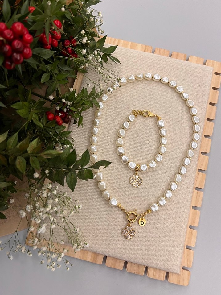 Zirkon taşlı yonca uç, akrilik barok inciler, gemici dümeni kilit, gold harf ve detaylar ile hazırlanan kolye bileklik.