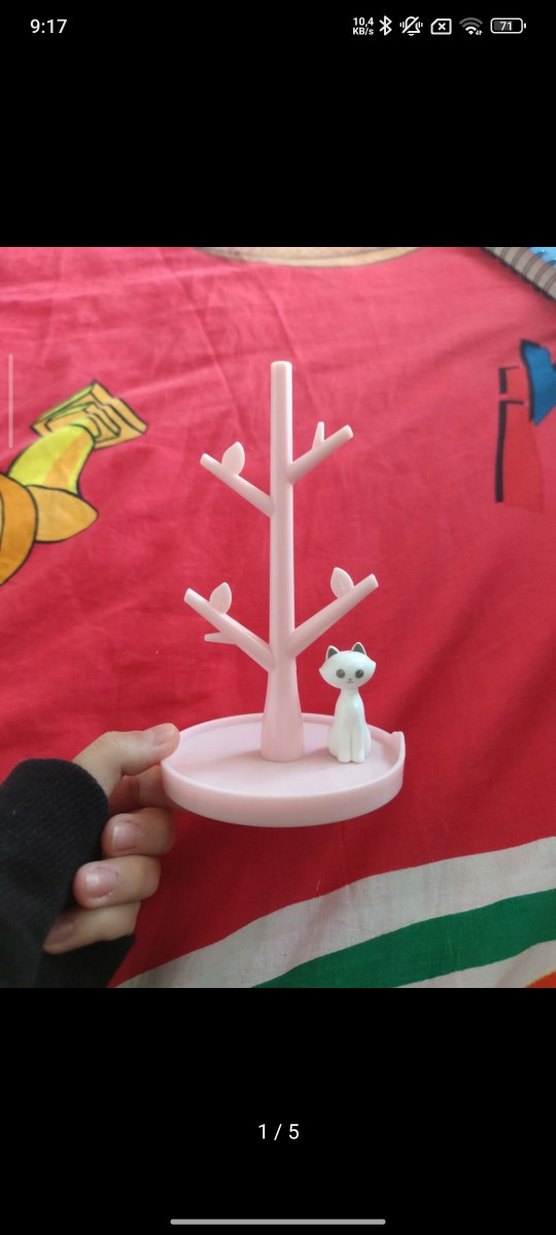 Pastel pembe renkte, çoklu dallara sahip kedi aksesuar standı, tabanında sevimli kedi figürü bulunur.