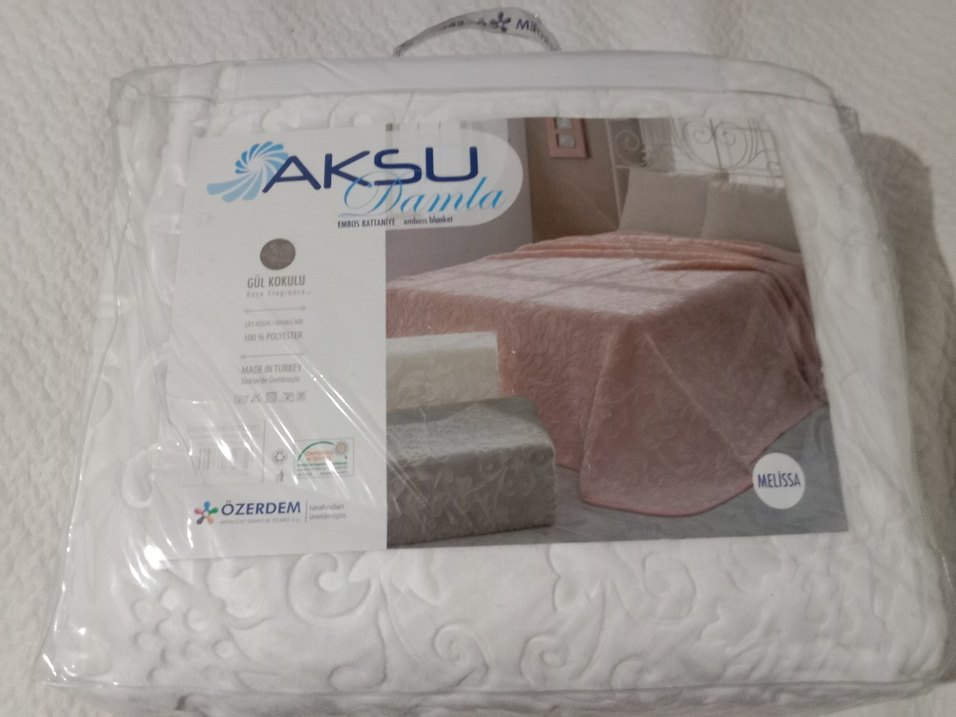 Aksu battaniye beyaz ve gri tonlarda desenli, yumuşak ve dayanıklı kumaşa sahiptir. Türkiye'de üretilmiştir ve çiçek kokusu içerir.