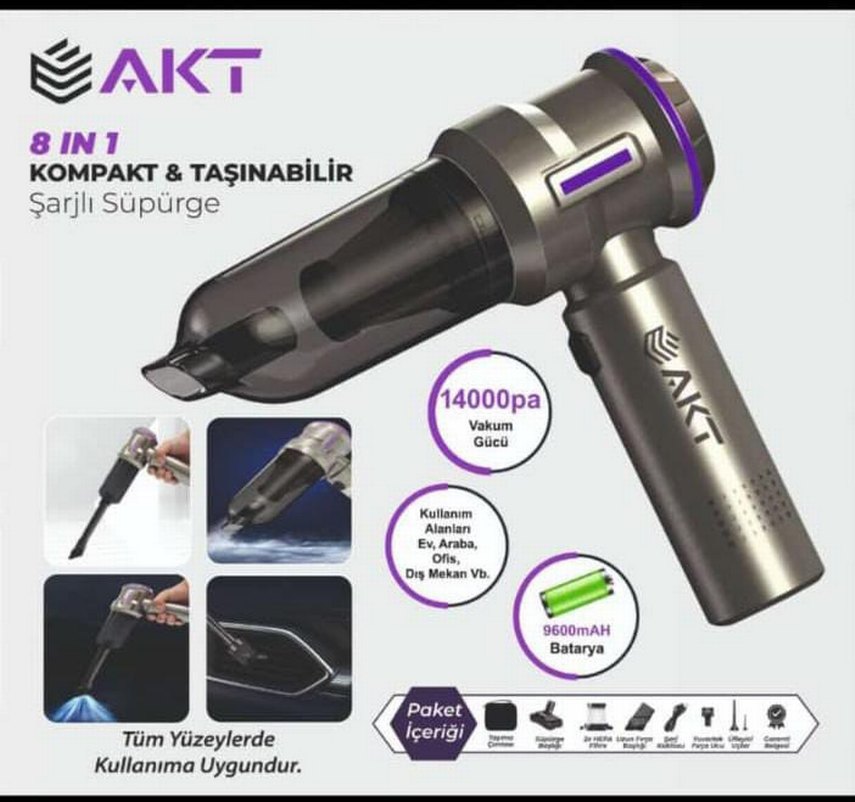 AKT taşınabilir elektrikli süpürge, 14000pa vakum gücü ve 9600mAh batarya kapasitesi ile ev, araba, ofis ve dış mekanlarda kullanıma uygundur. Paket içeriği çeşitli başlıklar içerir.
