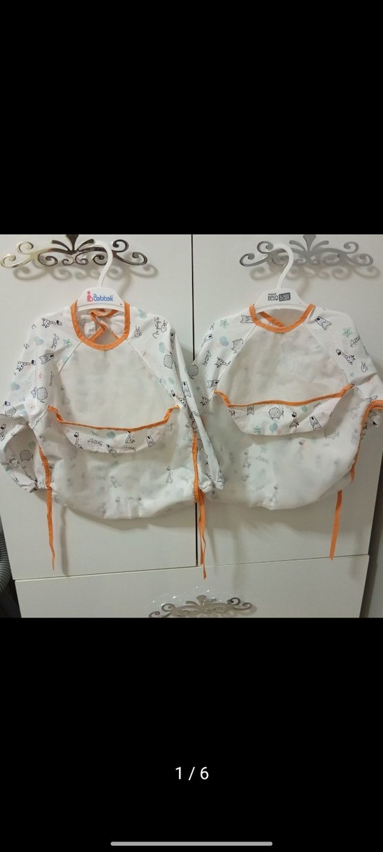 Beyaz, turuncu detaylı uzun kollu, pastel desenli baskılı bebek önlükleri, yemek sırasında kıyafet koruması sağlar. ️