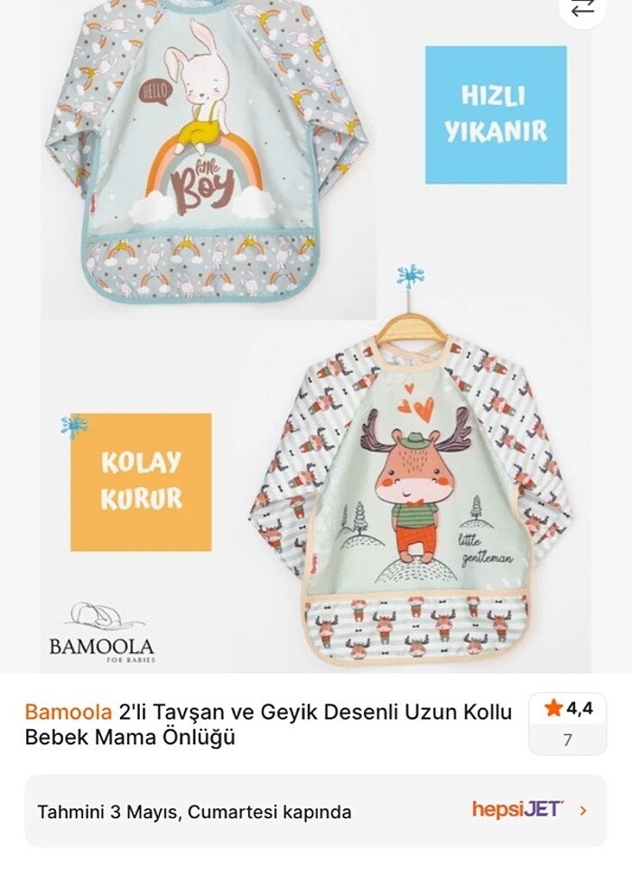 2’li almıştım o kadar kaliteli çıktı ki diğerini defalarca kullanmamıza rağmen rengi dahi solmadı kızım büyüdüğü içün kolları kısaldı ama biz hâlâ kullanıyoruz geyikli olanı bunu yedekte tutmuştum paketiyle duruyor hiç kullanılmadı sıvı geçirmez hızlı kuruma ürün özellikleridir #aktiviteönlüğü #önlük #sıvıgeçirmez #mamaönlüğü