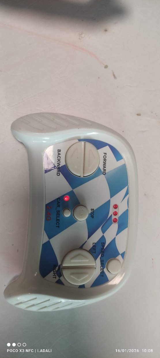 Akülü araba kumandası 2.el temiz çalışır durumda sorunsuz. Yön tuşları FORWARD ve BACKWARD olarak işaretlenmiş, araba seçme ve durdurma düğmeleri bulunan kumanda