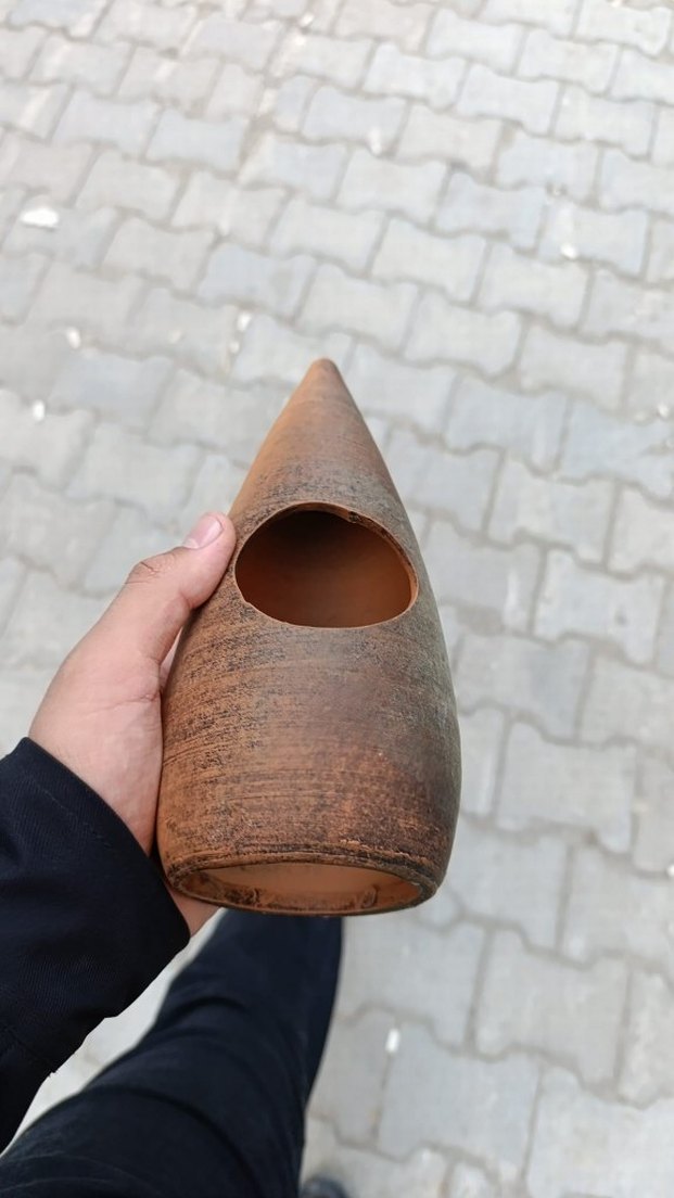 kahverengi renkte, üçgensi prizma şeklinde ve hafif yuvarlak açıklığı olan akvaryum icin dokulu malzemeden yapılmış dekoratif vazo. Rustik bir görünüm sunar, yenidir, her çeşit akvaryuma uygundur 20 cm kadar var ✨