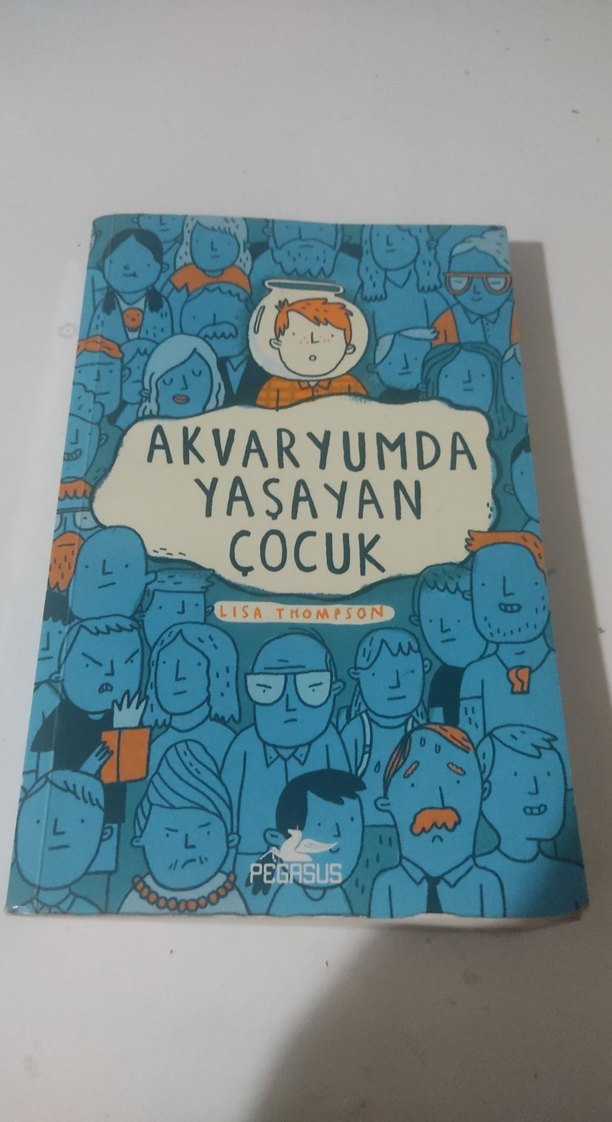 Lisa Thompson imzalı 'Akvaryumda Yaşayan Çocuk' kitabı, mavi kapakta karikatür yüzler ve Pegasus logosu bulunuyor.
