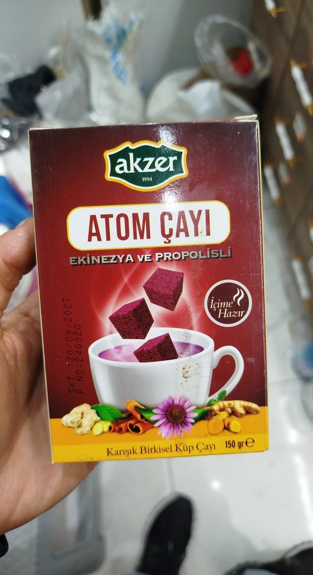 Akzer Atom Çayı, ekinezya ve propolis içeren karışık bitkisel küp çaydır. 150 gramlık bordo kutuda, içime hazırdır.