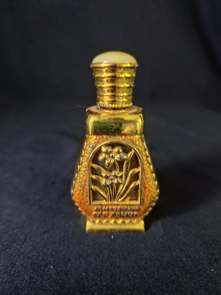 Al Haramain Alf Zahra Kadın Parfüm Yağı metal Altın renkli, önünde çiçek desenleri olan kadın parfüm şişesi. Yuvarlak kapaklı ve vintage görünümlü.