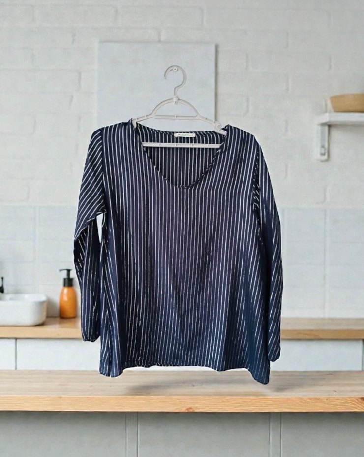 Alaçatı Mavi çizgili, V yaka, uzun kollu kadın gömlek. Salaş kesim, pile detaylı ve normal midi boyda. Günlük rahat sokak stili için uygundur. Üzerinde leke yoktur gölgeden dolayı bu şekilde gözükmektedir hiçbir sorunu yok yepyeni