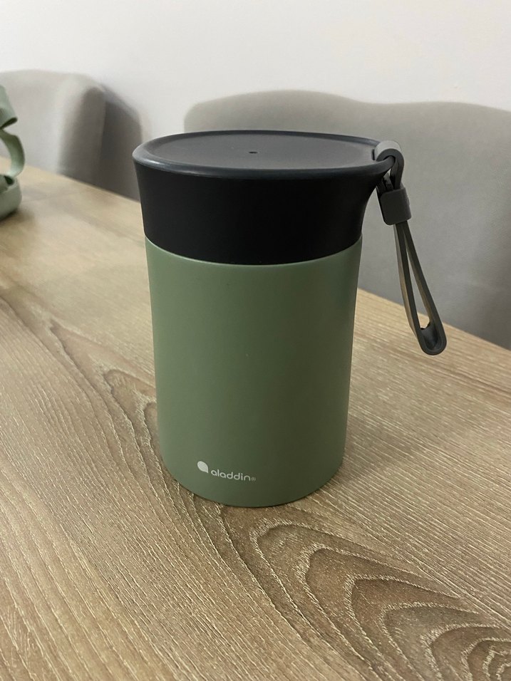 Haki renkli Aladdin çocuk termosu, taşıma kayışlı siyah kapak ile sıcak içecekler için uygundur. 2/3 kere kullanılmıştır yep yeni defosu yok