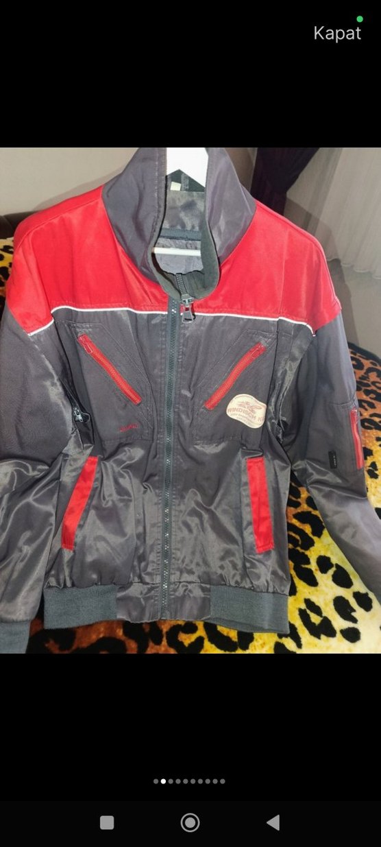 Fermuarlı, uzun kollu, kısa kesim gri-kırmızı sokak stili erkek mont. Sentetik kumaştan yapılmış, notched lapel ve baskılı detaylara sahip orijinal yurtdışı üründür kolları çıkıyor yelek oluyor su geçirmez çok kalitelidir fiyat sondur kol boyu 65cm koltukaltı 65cm omuzdan bele 70cm