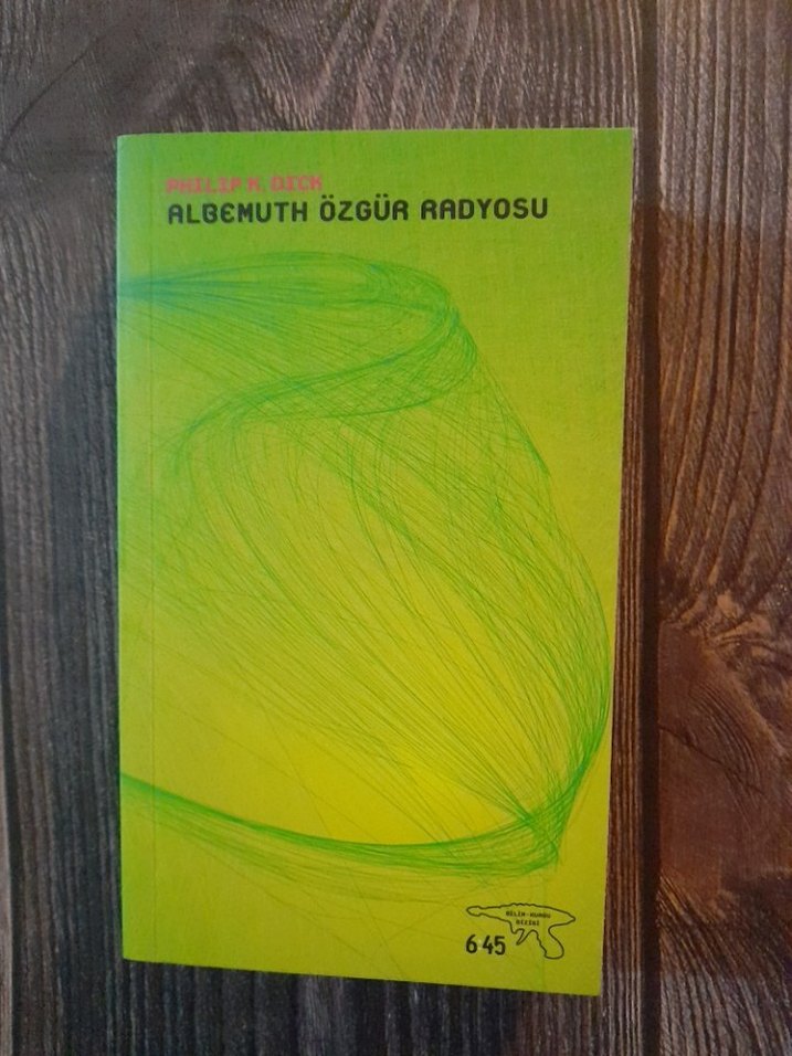 Philip K. Dick'in 'Algemuth Özgür Radyosu' adlı şiir kitabı, soyut çizgilerle yeşil kapak tasarımına sahiptir.