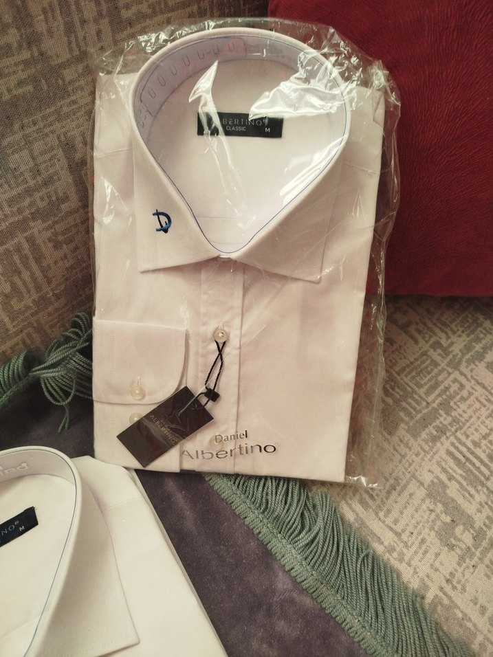 Albertino markalı, parlak sentetik kumaştan beyaz uzun kollu gömlek. Düğmeli, baskılı desenli, klasik yakalı ve normal boyda, ofis ve günlük kullanıma uygun.