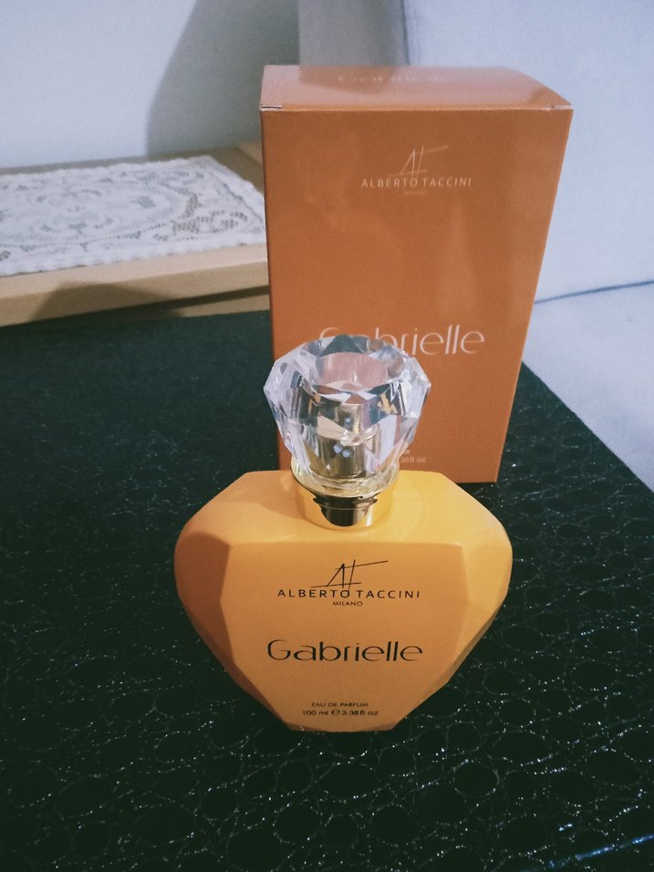 Alberto Taccini Gabrielle kadın parfümü, kristal görünümlü kapaklı şık şişede ve turuncu kutuda sunulmaktadır.