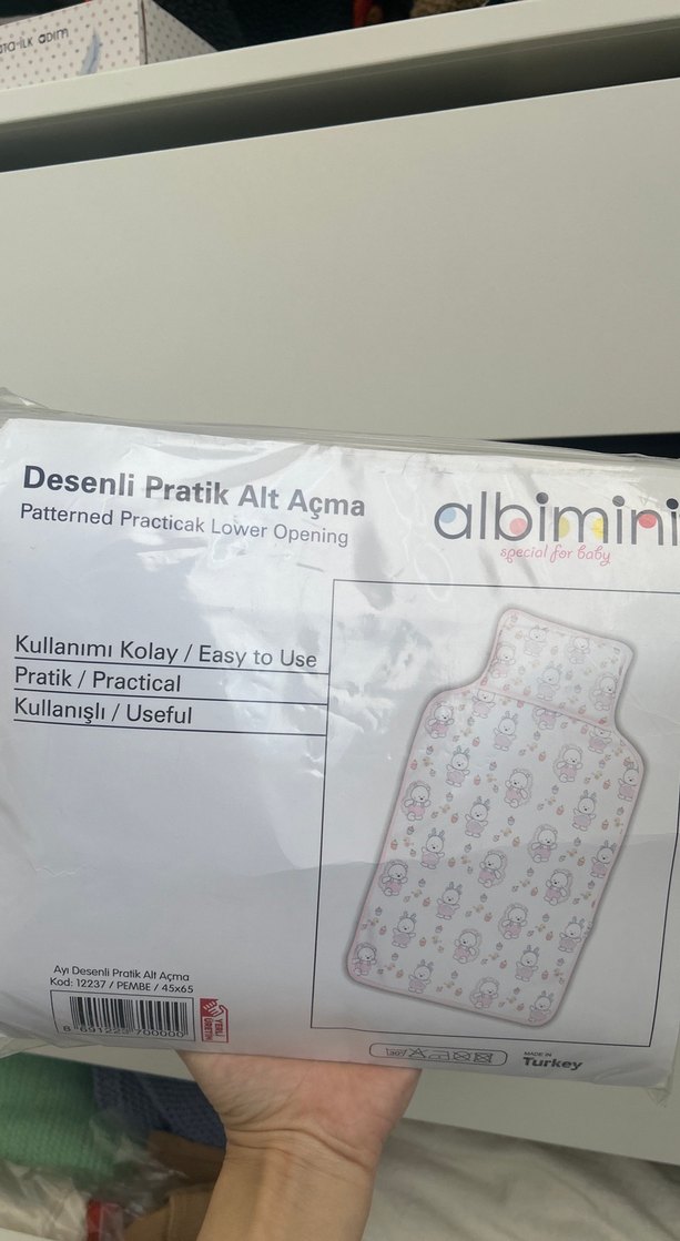 Albimini bebek alezi, beyaz plastik üzerinde pastel desenlidir. Pratik alt açma özelliği ve kullanımı kolay yapısıyla çocuk yatakları için koruma sağlar. ️