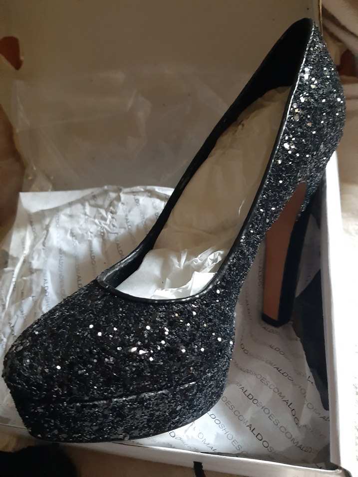 Siyah parlak simli, yüksek ökçeli, platformlu abiye ayakkabı