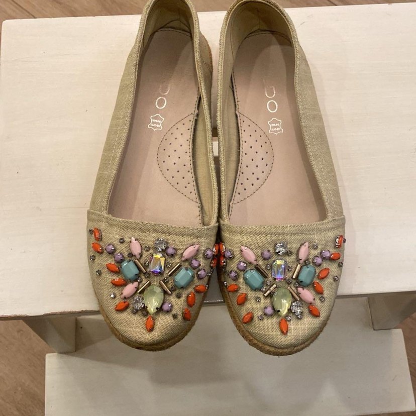 Keten krem rengi 38 numara ön kısmı renkli taşlı şık rahat hafif