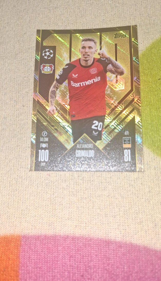Alejandro Grimaldo'nun futbol rozeti, altın renkli detaylar ve takım logoları ile dikkat çekiyor. Koyu ve canlı arka planlı pop kültür tarzında. ⚽